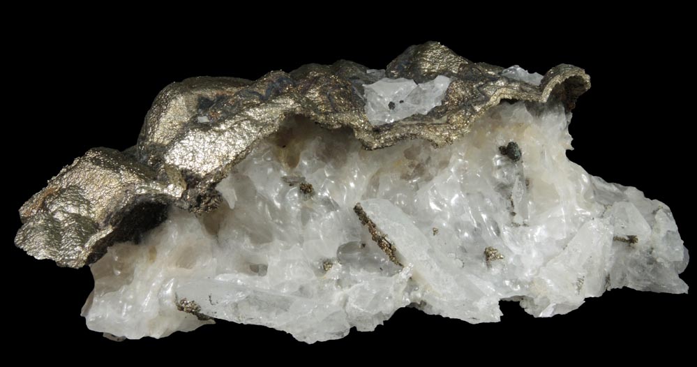 | Description: | Thin (1 mm) yellow-metallic pyrite pseudomorphs after rhombohedral calcite crystals to 25 mm over colorless transparent quartz crystals to 20 mm. Sequence: quartz formed > calcite grew on top > pyrite grew over the calcite > calcite partially dissolved. Collected in 2014 |