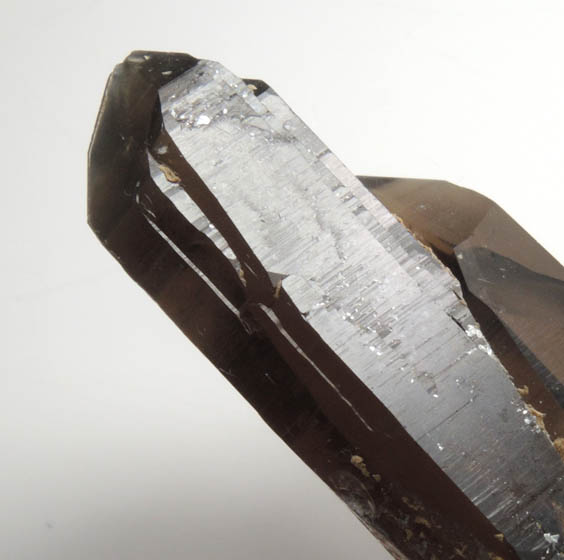 | Description: | Two parallel lustrous translucent smoky quartz crystals to 44 mm with remnants of white microcline on the bottom. The smoky quartz crystals have suture patterns indicating that they are twinned following the Dauphiné Law of quartz twinning. Ex. Thomas A. Penney (1934-2019) collection, collected in the 1960s-70s. |