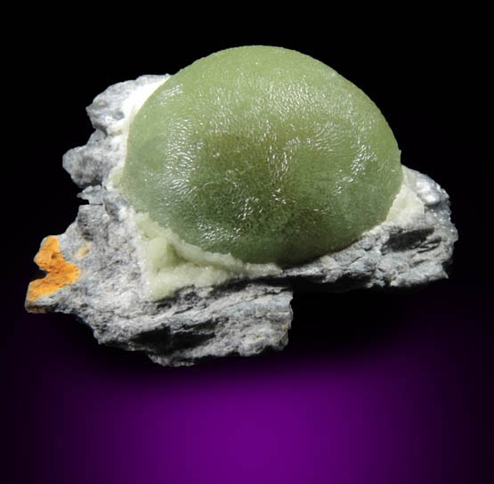 | Description: | Green bladed wavellite crystals in a hemispherical formation 10 mm diameter on gray matrix. The surface of the wavellite formation has a silky luster caused by microscopic crystal terminations. Has remnants of glue on one edge where it was mounted. |