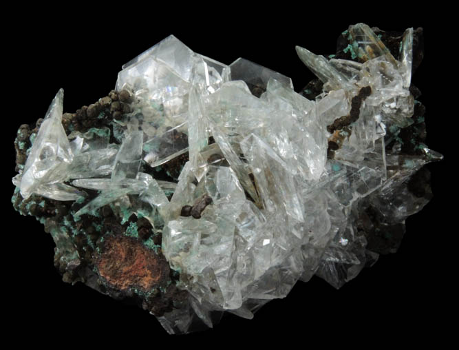| Description: | Lustrous transparent colorless calcite crystals to 9 mm on brown limonite gossan with blue-green rosasite microcrystals in crevices scattered throughout. The calcite crystals are thin hexagonal (platy) form with shallow beveled edge faces. collected in 2012 |