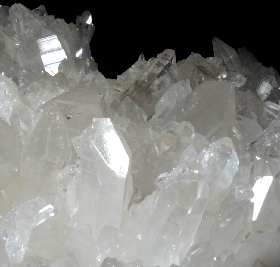 | Description: | Large plate of lustrous transparent colorless quartz crystals over an earlier generation of translucent white quartz crystals. The quartz crystals have horizontal striations on the prism faces and flat glassy termination faces. Ex. D. Miller collection #M149 |