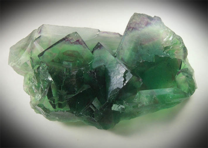 | Description: | Elongated plate of transparent cubic fluorite crystals with deep green color in phantom-growth zones. The green phantom zones are rotated 45° off the axis of the outer cubic faces of the fluorite crystals. Ex. D. Miller collection #M1791 |