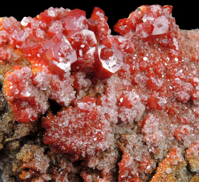 | Description: | Lustrous translucent vivid-red hexagonal vanadinite crystals to 6 mm covering the sides and edges of brown calcite with partial overgrowth of translucent white disc-like calcite crystals to 1 mm. The small vanadinite crystals are yellow-orange color. Ex. D. Miller collection #M1451 |
