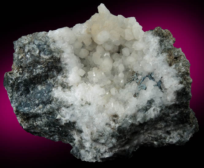 | Description: | Lustrous translucent white natrolite crystals lining a shallow cavity in gray serpentine. The natrolite crystals are stubby square prisms with four-sided pyramidal terminations. Ex. D. Miller collection #M1785 |