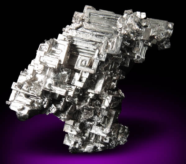 | Description: | Lustrous silver-metallic synthetic (man made) bismuth crystals exhibiting complex hoppered form with many parallel rectangular crystal faces. Ex. D. Miller collection #M2637 |