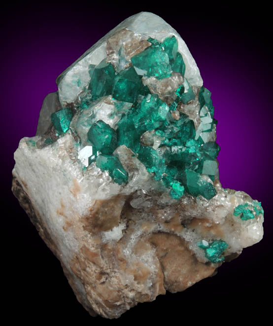 | Description: | Lustrous transparent vivid-green dioptase crystals to 6 mm in transparent colorless calcite that was partially dissolved to expose the dioptase crystals. More dioptase crystals are visible in the calcite and could be exposed. Ex. D. Miller collection #M2051 |