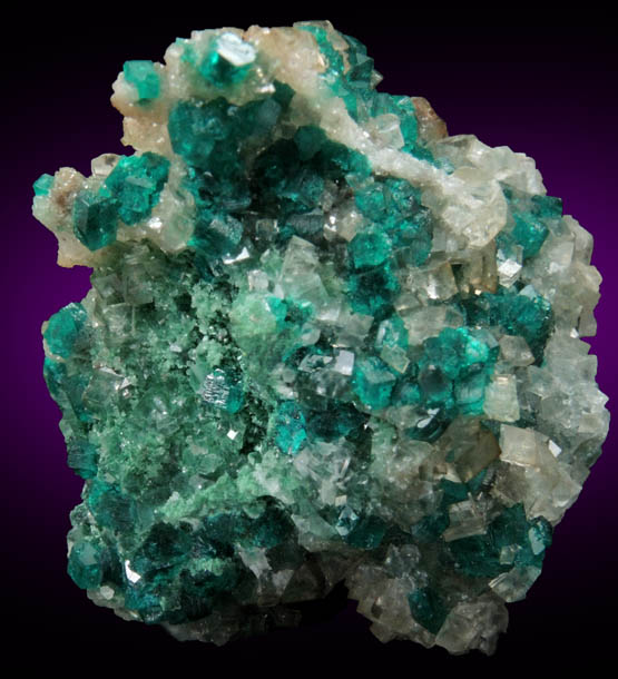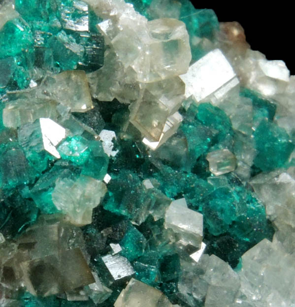 | Description: | Lustrous transparent vivid-green dioptase crystals to 2 mm with lustrous transparent colorless rhombohedral calcite crystals to 2 mm covering all sides of the specimen, with olive-green duftite microcrystals on one face. Ex. D. Miller collection #M427 |