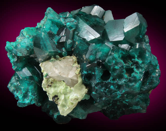 | Description: | Large lustrous transparent green dioptase crystals with remnants of calcite that was dissolved to expose the dioptase crystals. Ex. D. Miller collection #M1287 |
