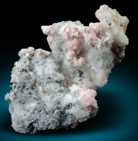 | Description: | Translucent pink rhombohedral rhodochrosite crystals to 3 mm over lustrous transparent colorless-to-gray cubic fluorite crystals to 4 mm with minor pyrite and sphalerite microcrystals scattered throughout on milky quartz. Ex. D. Miller collection #M039a; originally acquired from Joe Dorris |