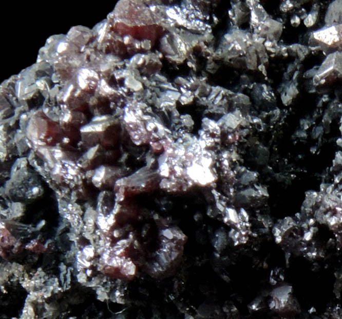 | Description: | Rich specimen of rare silver minerals: lustrous translucent dark-red proustite crystals to 1 mm with dark gray-metallic acanthite crystals to 1 mm and translucent dark-brown xanthoconite crystals to 0.5 mm. Ex. D. Miller collection #M1415 |