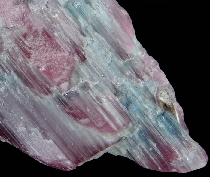 | Description: | Unusual crystal of translucent pink rubellite tourmaline, the pink gem variety of the mineral species elbaite, with overgrowth of chatoyant rubellite tourmaline crystals with green terminations. The chatoyancy is caused by the fibrous crystal structure. Ex. D. Miller collection #M2379 |