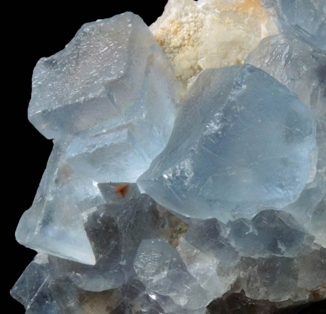 | Description: | Transparent blue cubic fluorite crystals on limonite-stained quartz. The fluorite crystals have microscopic crystallization patterns on the faces giving them a satin-like luster. Ex. D. Miller collection #M261 |