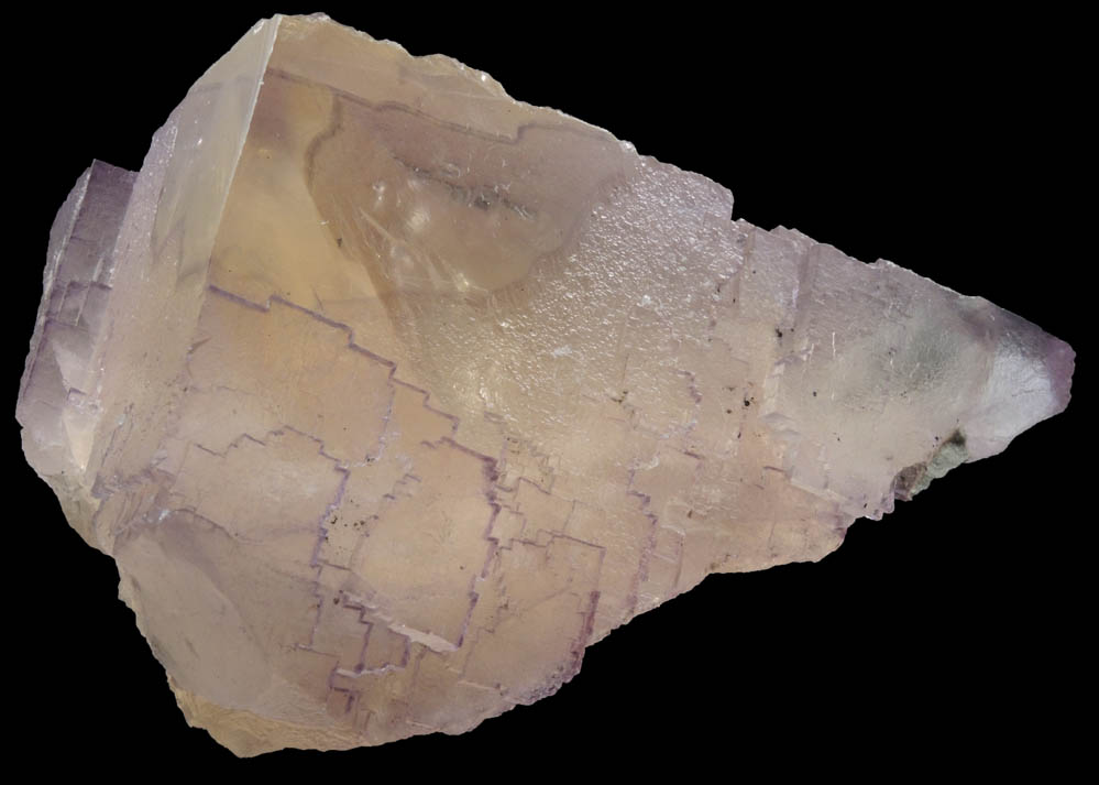 | Description: | Large transparent cubic fluorite crystal that is yellow internally with thin purple outer layer. The surfaces of the fluorite crystal are composed of many smaller cubic faces, but the corner is glassy revealing the yellow core. The top edge is chipped. |