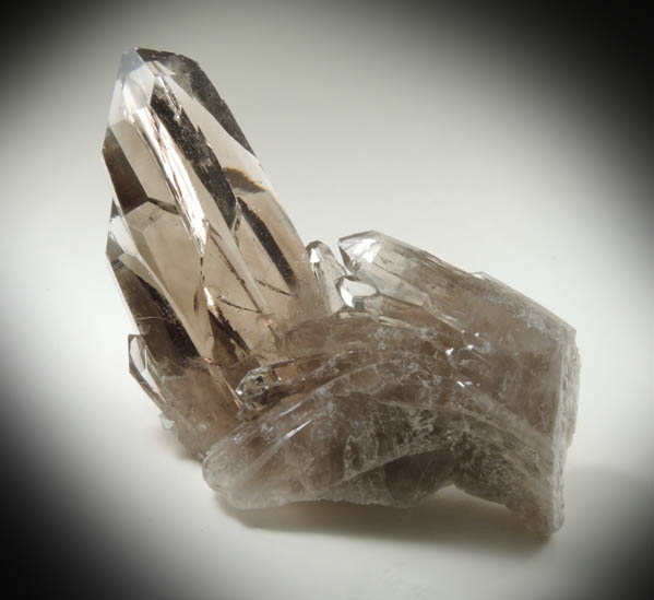 | Description: | Two intersecting groups of lustrous smoky quartz crystals. The upper crystals are water-clear and twinned following the Dauphiné Law of quartz twinning. See article: The Smoky Bear Quartz Claims: Lincoln County, New Mexico in Min. Rec., Sept.-Oct. 1991. Collected ca. 1988 |