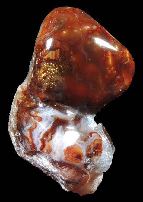 | Description: | Translucent fire agate nodule, the gem variety of quartz known for colorful internal patterns, with translucent gray agate on the bottom. The outer surfaces were polished to highlight the brown fire agate with green, yellow, orange internal fire. |