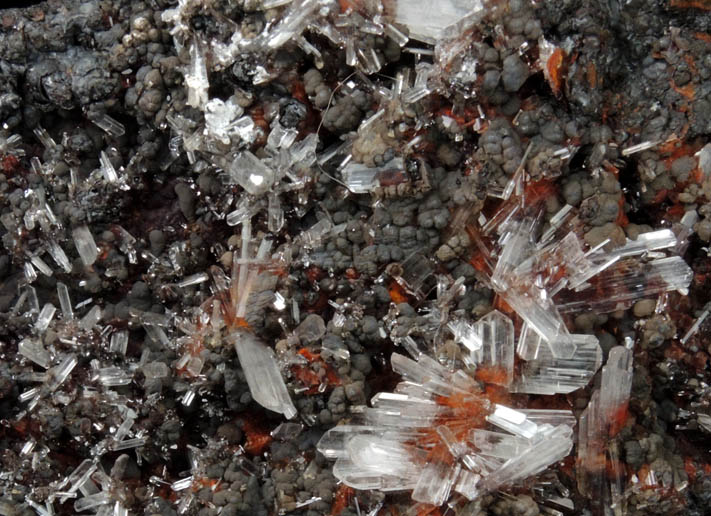 | Description: | Lustrous transparent colorless rhombohedral calcite crystals to 4 mm over lustrous transparent colorless bladed hemimorphite crystals to 9 mm. The calcite does not cover the rear where the hemimorphite crystals are more visible. Ex. D. Miller collection #2021 |