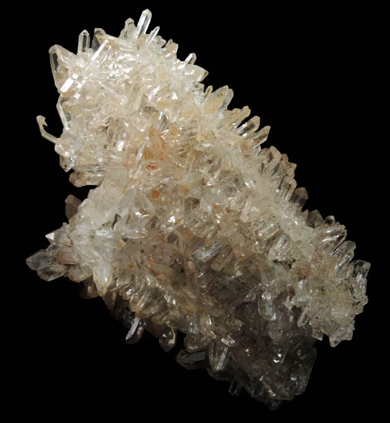 | Description: | Sparkling cluster of lustrous transparent colorless quartz crystals that have hollow pseudomorphic molds on the inside after an unidentified mineral, possibly barite. It formed first, then was overgrown by quartz crystals, then finally dissolved. |