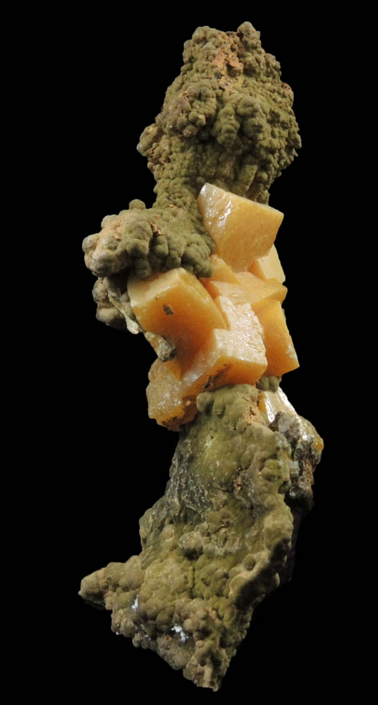 | Description: | Lustrous translucent yellow-orange blocky wulfenite crystals on brown limonite gossan coated with greenish-brown mottramite microcrystals. |