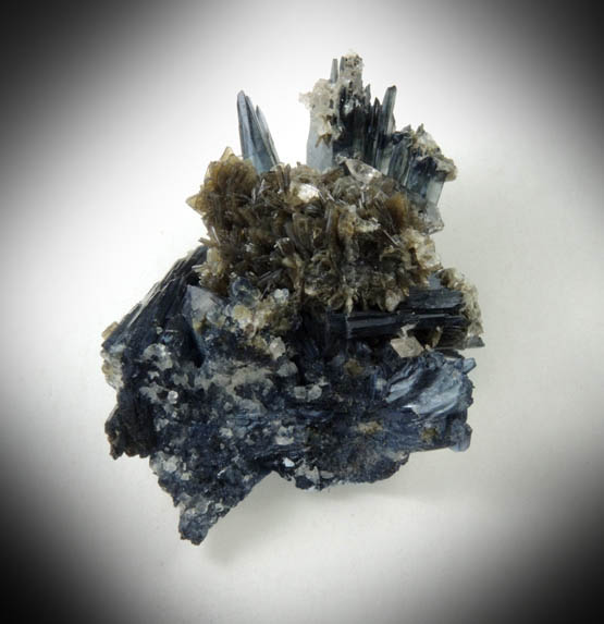 | Description: | Rich specimen of transparent greenish-brown arrojadite-(KFe) crystals to 1 mm with elongated transparent blue-black vivianite crystals to 8 mm. |