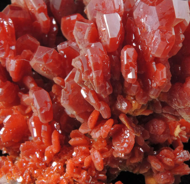 | Description: | Lustrous translucent red vanadinite crystals over brown matrix. The vanadinite crystals are hexagonal form modified with beveled {120} edge faces and have a brown-beige color on the rear faces caused by microscopic inclusions. Collected in 2011 |