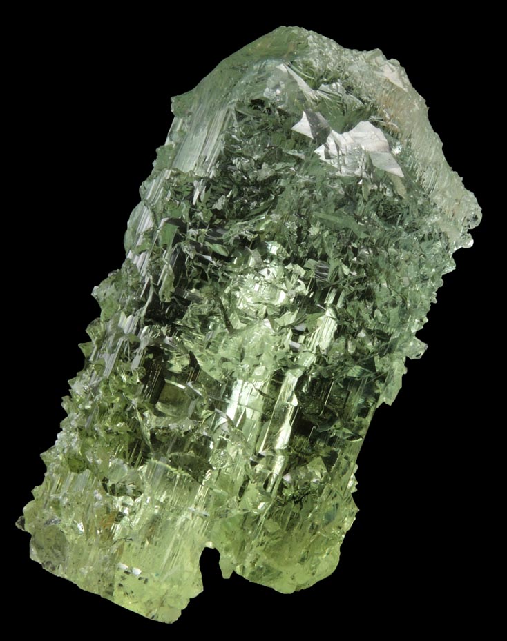| Description: | Lustrous transparent yellow-green heliodor crystal, the gem variety of the mineral beryl, with complex outer surfaces the result of post-crystallization dissolution. The heliodor crystal has a basal pinacoid face with pyramidal termination faces. This crystal has the green tint sought by collectors of gem crystals. Weight: 56.1 grams |