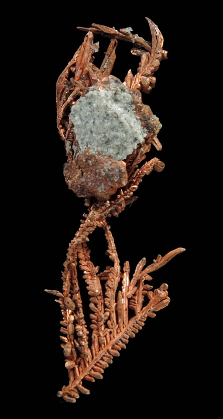| Description: | Finely crystallized native copper crystals (naturally occurring copper crystals) in feather-like flat formations of parallel crystals growing off central spine crystals with a small fragment of gray matrix included on the rear. |