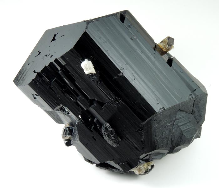 | Description: | Large lustrous black schorl tourmaline crystal with white albite included in a few surfaces. One area of the schorl tourmaline crystal has a thin crust of colorless hyalite opal that fluoresces bright green under SW UV illumination. |