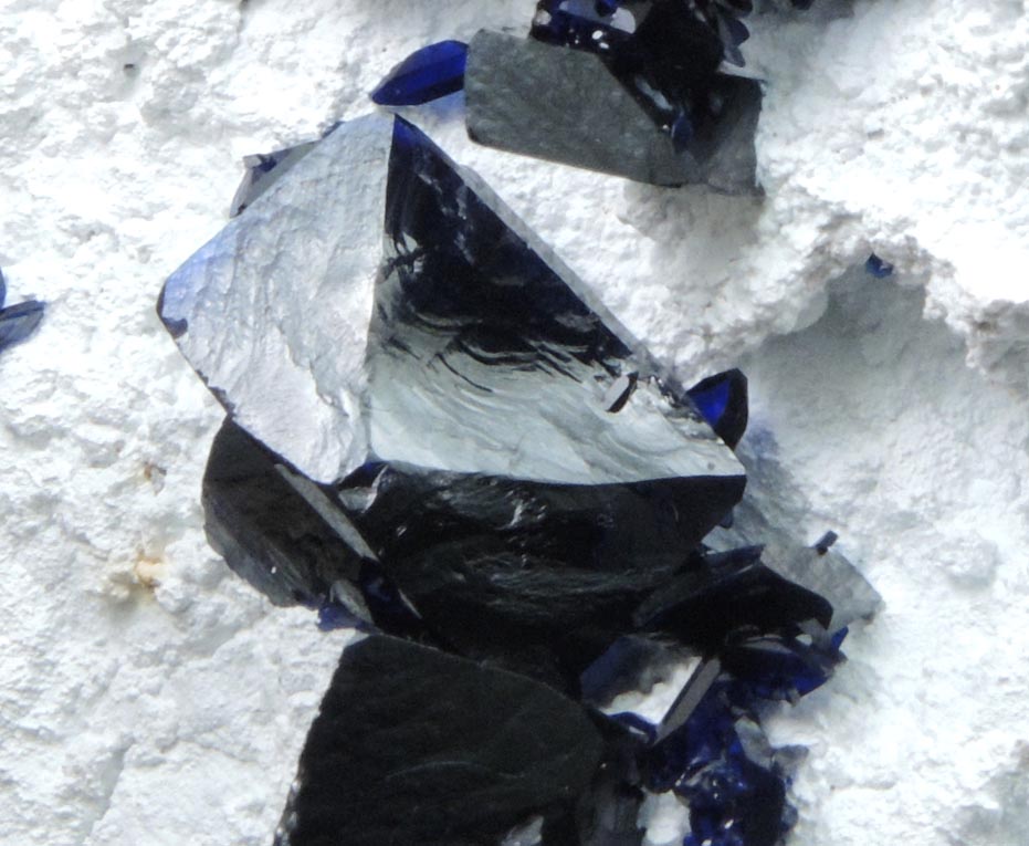| Description: | Unusually large azurite crystals (to 25 mm!) on one face of matrix coated with white clay. The azurite crystals exhibit excellent transparency where the crystals are thin and upright off the matrix. Two azurite crystals on the edges are incomplete. |