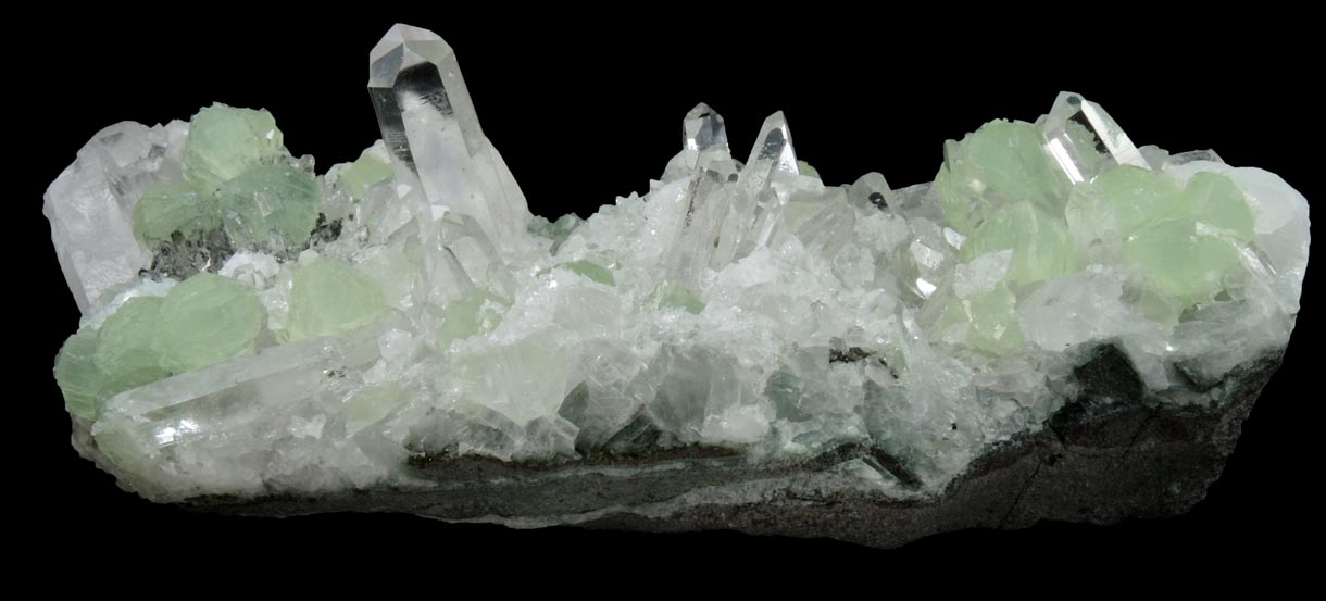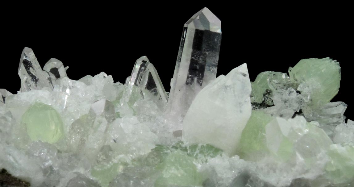 | Description: | Elongated plate of translucent green prehnite crystals in spherical aggregates to 12 mm with lustrous transparent colorless quartz crystals to 24 mm, four-sided colorless apophyllite crystals to 18 mm, translucent rhombic colorless calcite to 5 mm. |