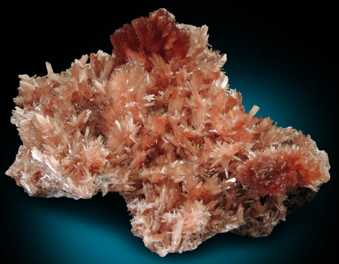 | Description: | Lustrous transparent pink-brown inesite crystals in fan-shaped aggregates to 12 mm of radiating crystals. The inesite crystals are slender blades with tapered terminations and appear pink-red under incandescent illumination. |