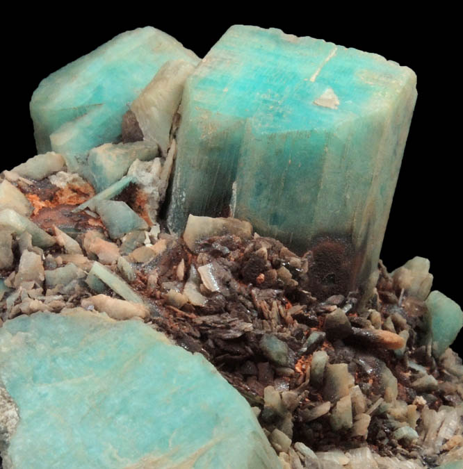 | Description: | Blocky blue-green amazonite crystals, the green variety of microcline colored by lead impurities, to 20 mm on colorless microcline plates that show post-crystallization fracturing and healing. |