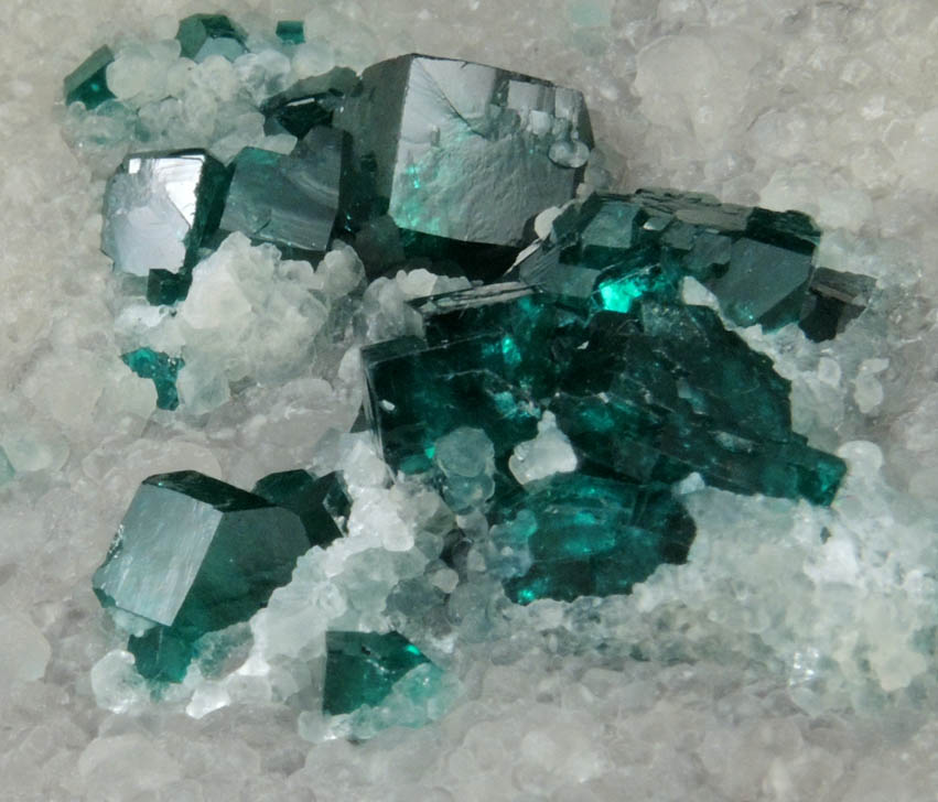 | Description: | Lustrous transparent deep-green dioptase crystals to 14 mm on translucent gray calcite crystals to 1.5 mm covering one face of matrix. The dioptase crystals exhibit very good transparency. |