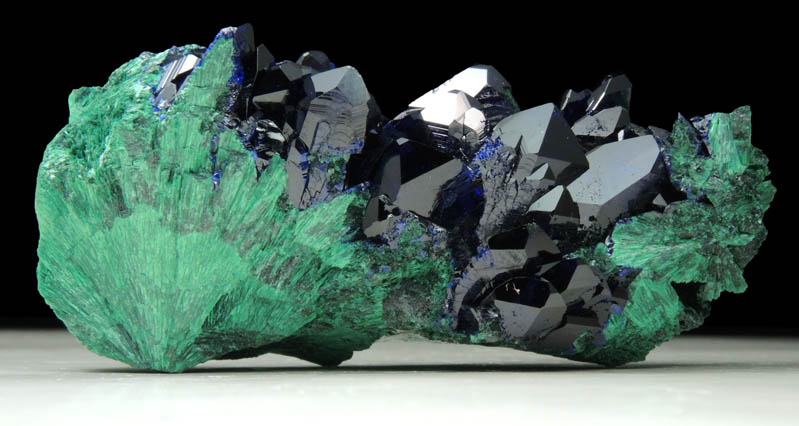 | Description: | Lustrous vivid-blue wedge shaped azurite crystals to 9 mm that altered internally to fibrous green malachite pseudomorphs after azurite. The vivid blue color of the azurite is because it is less than 1 mm thick as shown on the outer edges. |