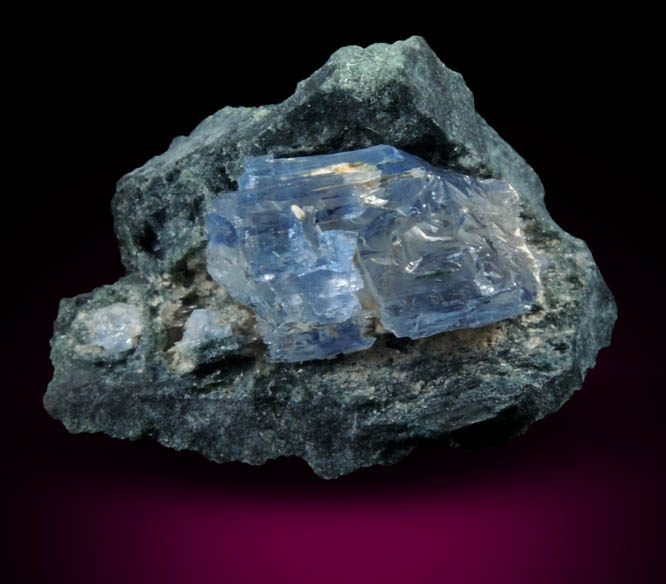 | Description: | Lustrous transparent blue jeremejevite crystal on finely crystallized foitite-elbaite tourmaline. The jeremejevite crystal is completely exposed and shows excellent internal clarity. Both terminations are composed of many pointed etched faces. |