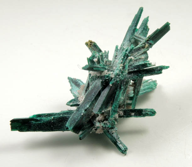 | Description: | Lustrous transparent green acicular brochantite crystals in intersecting groups of parallel crystals with remnants of white clay where they were attached. The fibrous structure of the brochantite crystals give them a chatoyant luster. Collected in 2012-2013 |