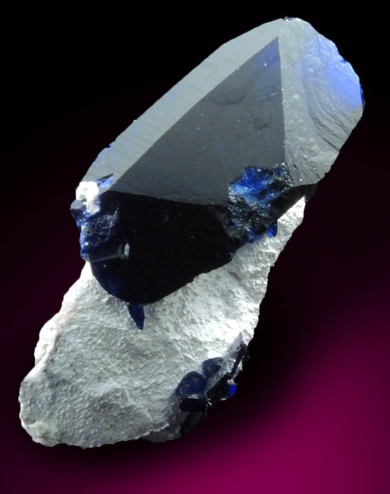 | Description: | Lustrous translucent dark blue azurite crystals on contrasting white clay-rich matrix. The largest azurite crystal is doubly terminated and has contacts on two edges where it intersected adjacent azurite crystals. |