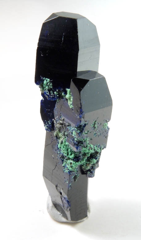 | Description: | Two lustrous prismatic dark-blue azurite crystals with remnants of green malachite on the contacts where the azurite crystals were attached. Both ends of the specimen have terminations. Ex. Georg Gebhard (author of Tsumeb I and II) |