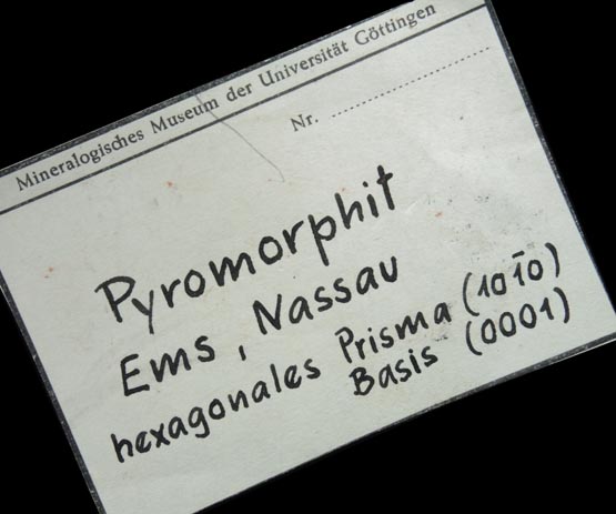 | Description: | Large single crystal of translucent brown pyromorphite with no matrix attached. The pyromorphite crystal is stout hexagonal form with flat termination composed of many smaller parallel crystal faces and complex crystallization patterns on the prism faces Ex. Mineralogisches Museum der Universität Göttingen; Ex. Georg Gebhard (author of Tsumeb I and II) |