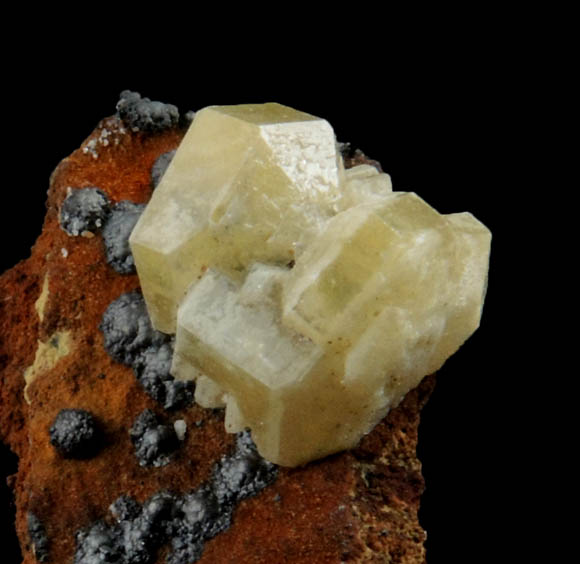 | Description: | Doubly-terminated translucent yellow mimetite crystals to 4.5 mm with minor black coronadite on brown gossan. The mimetite crystals are tabular hexagonal form with flat basal pinacoid terminations modified by pyramidal edge faces. Collected ca. 1980 |