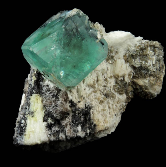 | Description: | Lustrous transparent green cubic 11 mm fluorite crystal on white albite-microcline feldspar with minor muscovite. One area has colorless hyalite opal that fluoresces bright green under SW UV illumination. |