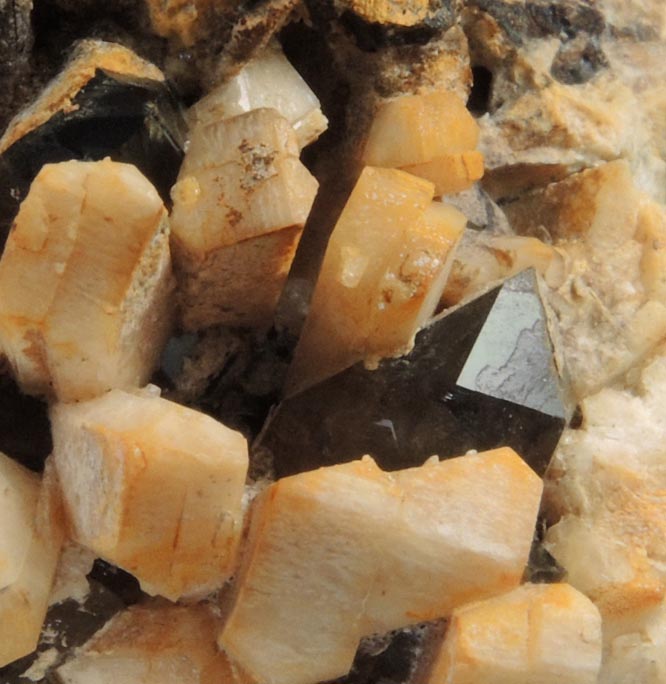 | Description: | Limonite-stained white microcline crystals, that are twinned following the Carlsbad Law of feldspar twinning, to 8 mm intermixed with lustrous dark smoky quartz crystals to 5 mm. Ex. Thomas A. Penney (1934-2019) collection, collected in the 1960s-70s |