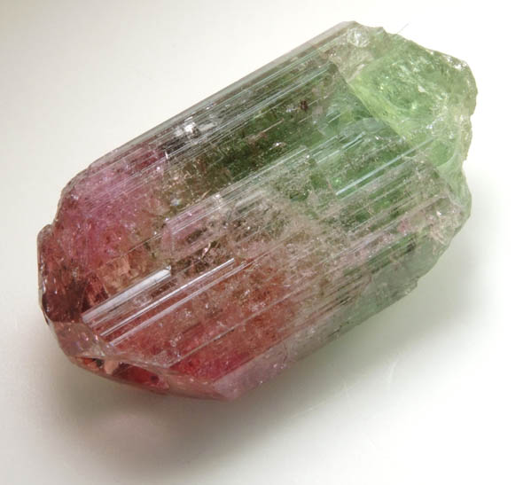| Description: | Bi-colored lustrous transparent elbaite tourmaline crystal with unusual negative tube running into the center of the crystal. The color of the elbaite tourmaline varies from pink to green. Weight: 9.4 grams |