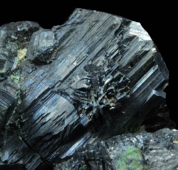 | Description: | Cluster of intersecting gray-metallic chalcocite crystals with blue chrysocolla in crevices between the crystals. Chalcocite, a copper sulfide mineral, is rare among the NJ zeolite cavities. The central chalcocite crystal is terminated. Collected by Kurt Hennig |