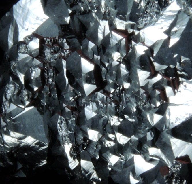 | Description: | Double-sided specimen of lustrous gray-metallic platy hematite crystals with red-brown limonite on the outer edges. The hematite crystals are hexagonal form with complex (pyramidal?) parallel faces that simultaneously reflect illumination. Collected ca. 1980 |