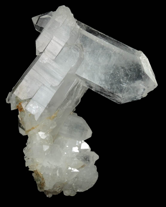 | Description: | Sculptural formation of lustrous transparent colorless quartz crystals exhibiting the Faden Habit of doubly-terminated crystals with milky center zones. Ex. Irving Horowitz collection |