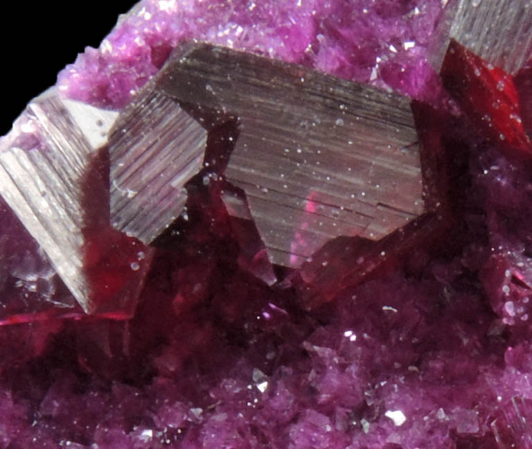 | Description: | Several large lustrous internally flawless transparent violet-colored kammererite crystals, the chrome-rich variety of the mineral species clinochlore, on gray matrix with smaller kammererite crystals surrounding the large crystals. Ex. Bruce Gaber collection #1145b |