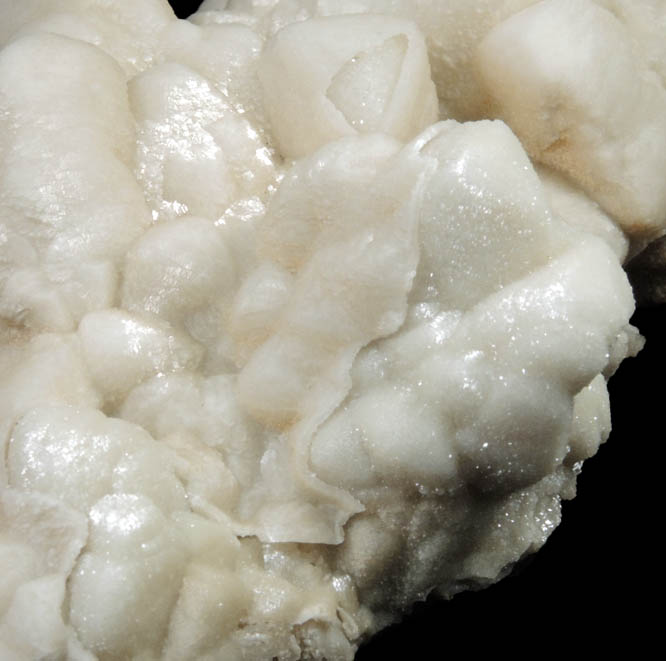 | Description: | Lustrous white dolomite crystals to 1 mm in several thin successive layers overgrown on tapered hexagonal calcite crystals to 16 mm with rhombic terminations. The surfaces are composed of parallel dolomite microcrystals that give them a satin luster. |