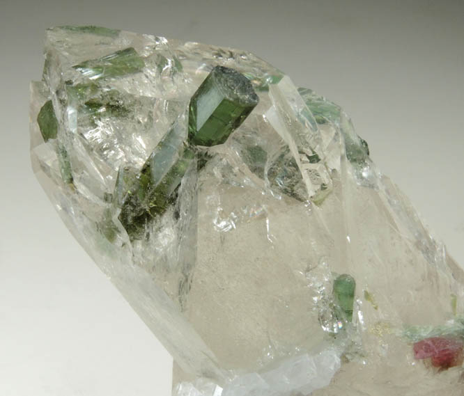 | Description: | Two transparent green elbaite tourmaline crystals to 25 mm included in a 55 mm lustrous transparent colorless quartz crystal. The elbaite tourmaline crystals are nearly flawless internally and are not terminated. |