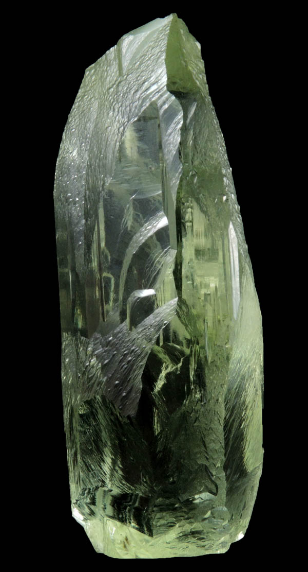 | Description: | Lustrous flawless gem-grade transparent yellow-green heliodor crystal, the gem variety of beryl, with complex outer surfaces the result of post-crystallization dissolution. The heliodor crystal has a complex termination with many secondary faces. This crystal has the green tint sought by collectors of gem crystals. Weight: 25.7 grams |