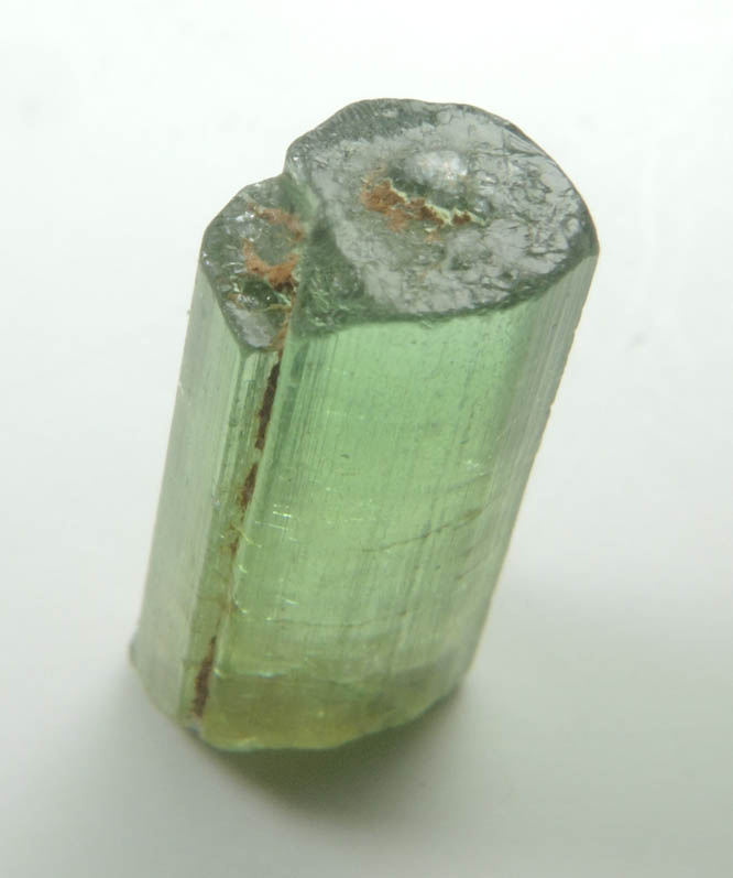 | Description: | Lustrous transparent green elbaite tourmaline crystal with no matrix. This elbaite crystal is flawless in the upper half and has a complex termination with basal pinacoid face modified by pyramidal edges with a smaller elbaite crystal in the center. Collected ca. 2006 |